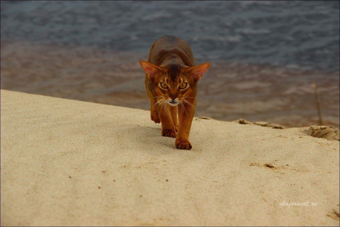 В Казани и окрестностях за несколько лет активного облагораживания прибрежных территорий из Волги было намыто много песка. Насыпая огромные его горы, не всегда сразу приступали к строительству либо набережных, либо зданий или домов. В результате, некоторые такие горы намытого песка стали похожи на пейзажи из африканских пустынь, если, конечно, забыть о том, что рядом течет огромная река. Ветер сделал свое дело, декорировав эти горы спокойными волнами. В результате получился такой необычный для умеренных широт Татарстана пейзаж, каким вы его можете увидеть на фотосессии абиссинского кота Яна ( CH CFA, CH TICA Shafran Yankovsky).
